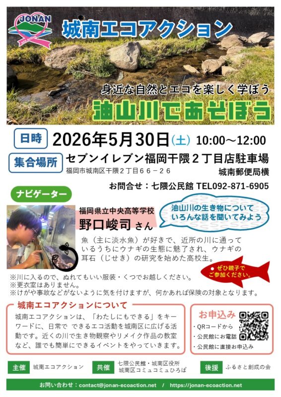 城南エコアクション5月のイベントは、油山川の生き物観察です。